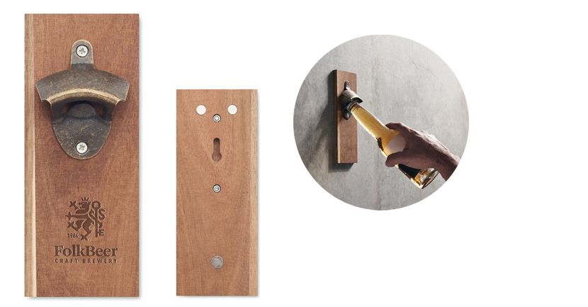 Décapsuleur mural en bois d'acacia et en fer. Il est doté d'un puissant aimant.