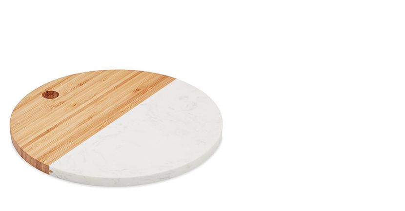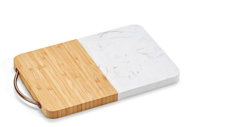 20 x 30 x 2 cm. En marbre et bambou, avec poignée.